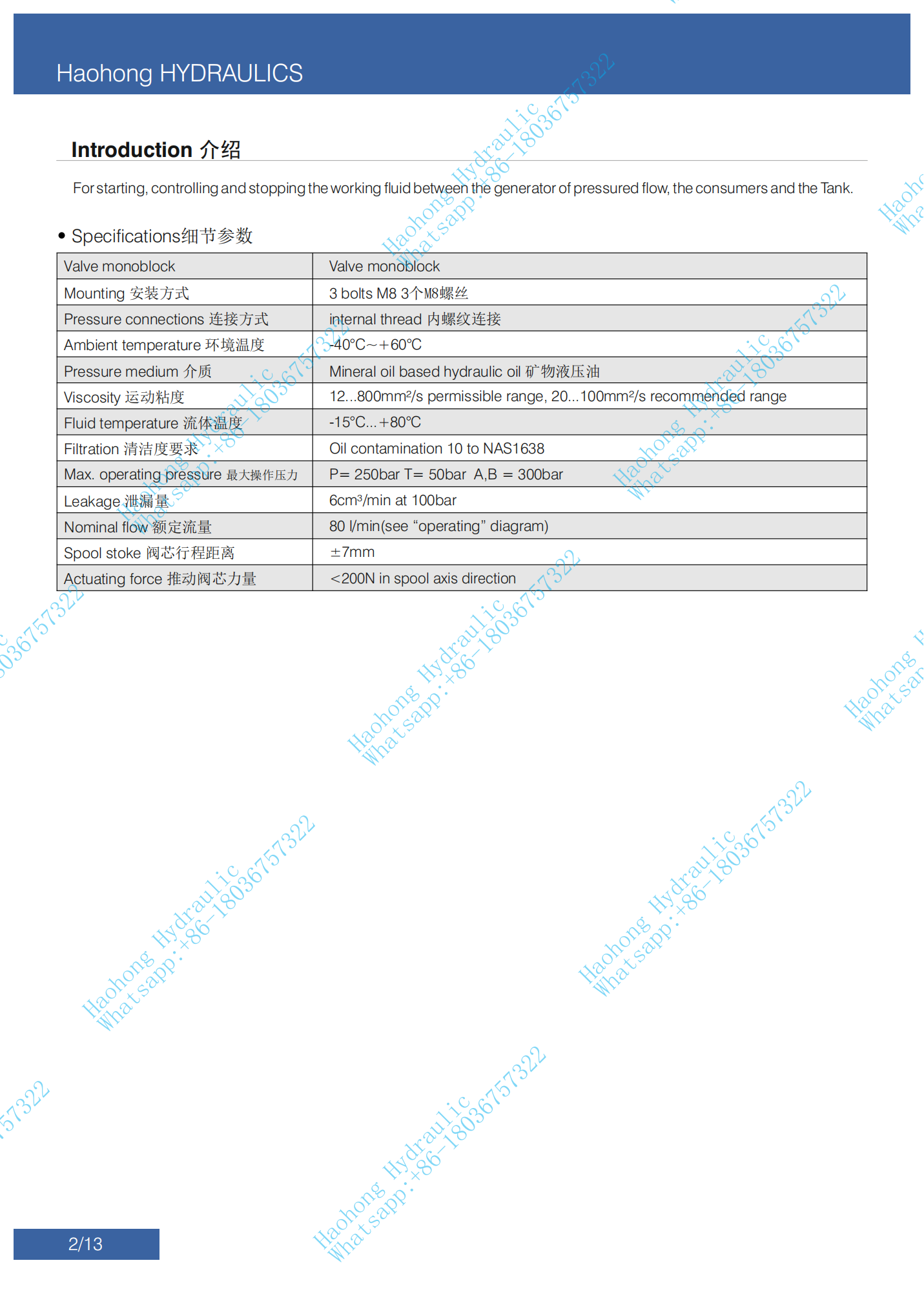 | Internal Leakage | 15 cc/min at 160 bar, 50℃ |
