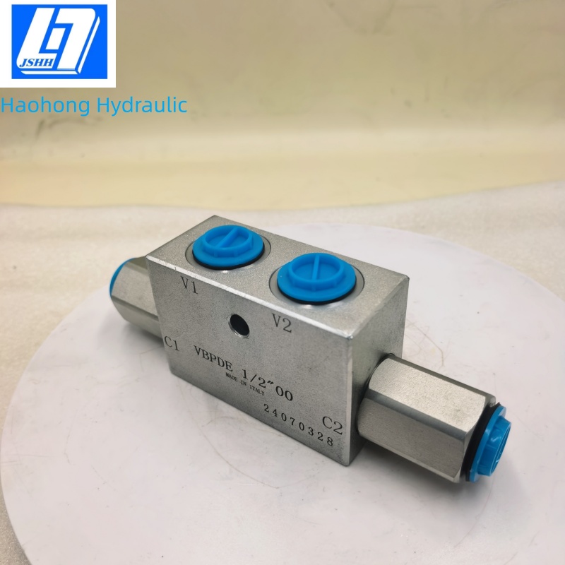 VBPDE(也有厂家标注型号为:DPOCV)先导式液压锁用于在进油、回油两个方向上锁住油缸。当先导油液没有施加在对侧方向的回路时,油液正向自由流动,反向截至,即为单向阀功能。当先导油液施加在对侧回路时,则正向、反向均可流动。(例如V1进油,C1出油。进入V1油口的油液分出一小部分,而此部分的油液即称为先导油液,该部分先导油液的压力足够打开V2至C2方向的单向阀,从而使得V1进油后,C1出油(比如C1后接油缸无杆腔),则C2进油V2出油。(C2接油缸有杆腔)