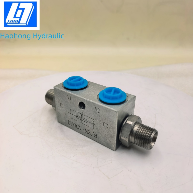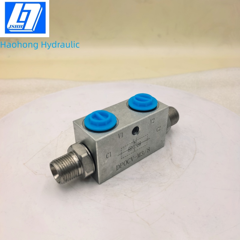 VBPDE(也有厂家标注型号为:DPOCV)先导式液压锁用于在进油、回油两个方向上锁住油缸。当先导油液没有施加在对侧方向的回路时,油液正向自由流动,反向截至,即为单向阀功能。当先导油液施加在对侧回路时,则正向、反向均可流动。(例如V1进油,C1出油。进入V1油口的油液分出一小部分,而此部分的油液即称为先导油液,该部分先导油液的压力足够打开V2至C2方向的单向阀,从而使得V1进油后,C1出油(比如C1后接油缸无杆腔),则C2进油V2出油。(C2接油缸有杆腔)