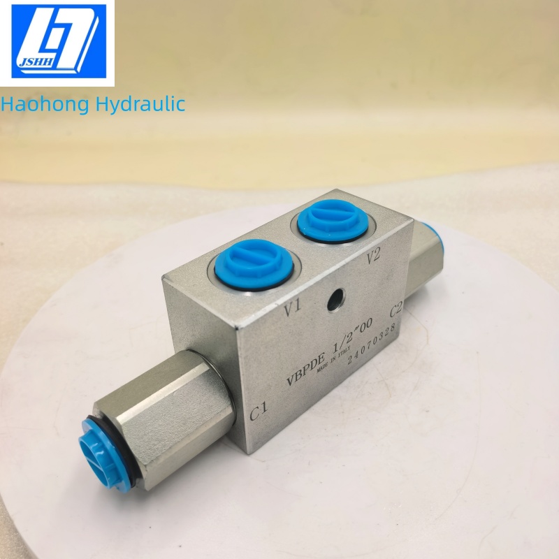 VBPDE(也有厂家标注型号为:DPOCV)先导式液压锁用于在进油、回油两个方向上锁住油缸。当先导油液没有施加在对侧方向的回路时,油液正向自由流动,反向截至,即为单向阀功能。当先导油液施加在对侧回路时,则正向、反向均可流动。(例如V1进油,C1出油。进入V1油口的油液分出一小部分,而此部分的油液即称为先导油液,该部分先导油液的压力足够打开V2至C2方向的单向阀,从而使得V1进油后,C1出油(比如C1后接油缸无杆腔),则C2进油V2出油。(C2接油缸有杆腔)