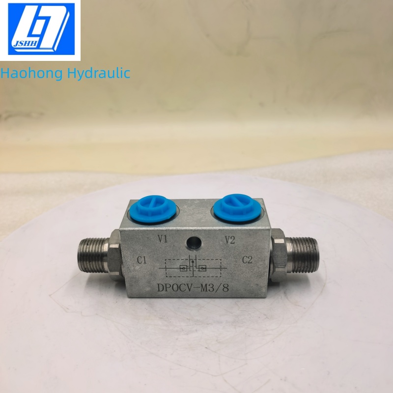 VBPDE(也有厂家标注型号为:DPOCV)先导式液压锁用于在进油、回油两个方向上锁住油缸。当先导油液没有施加在对侧方向的回路时,油液正向自由流动,反向截至,即为单向阀功能。当先导油液施加在对侧回路时,则正向、反向均可流动。(例如V1进油,C1出油。进入V1油口的油液分出一小部分,而此部分的油液即称为先导油液,该部分先导油液的压力足够打开V2至C2方向的单向阀,从而使得V1进油后,C1出油(比如C1后接油缸无杆腔),则C2进油V2出油。(C2接油缸有杆腔)